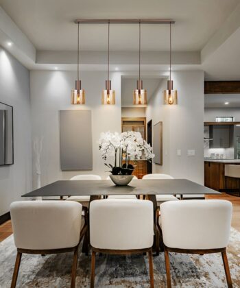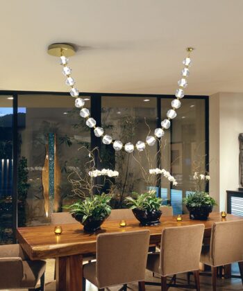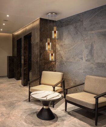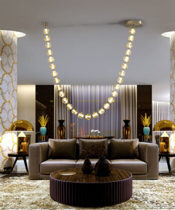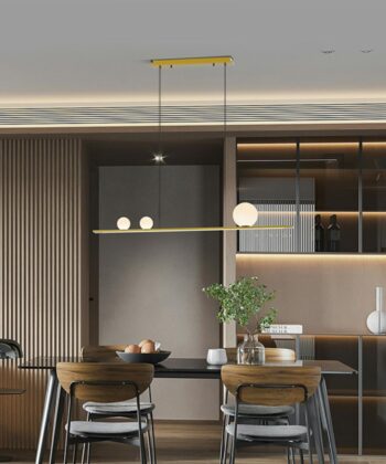Acabamento: alumínio escovado em dourado e vidro branco opalino
