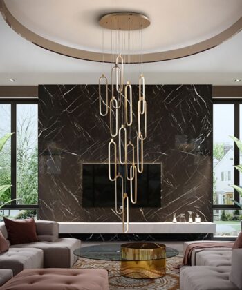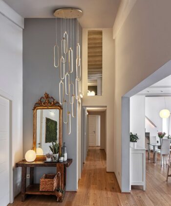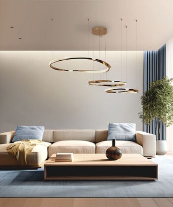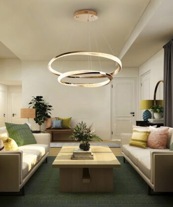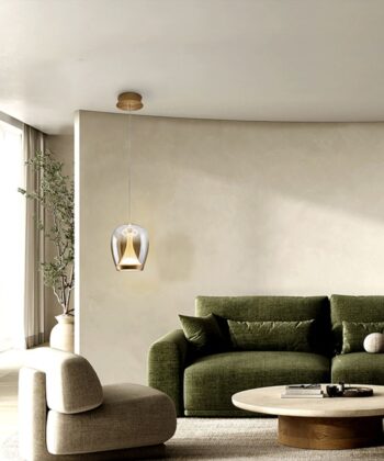 Acabamento: alumínio escovado em dourado e vidro branco opalino