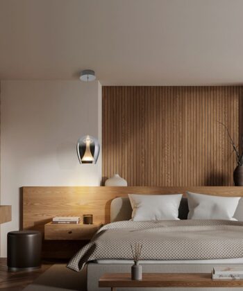 Acabamento: alumínio escovado em preto e vidro branco opalino