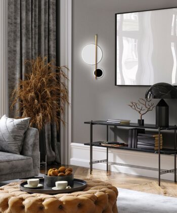 Acabamento: alumínio escovado em preto e vidro branco opalino