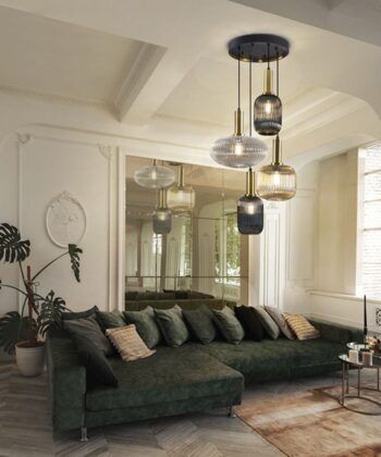 Acabamento: metal preto mate e latão com abajures de vidro transparente, âmbar e fumado
