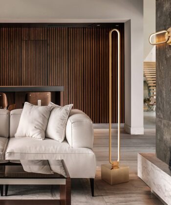 Acabamento: alumínio escovado em dourado e vidro branco opalino