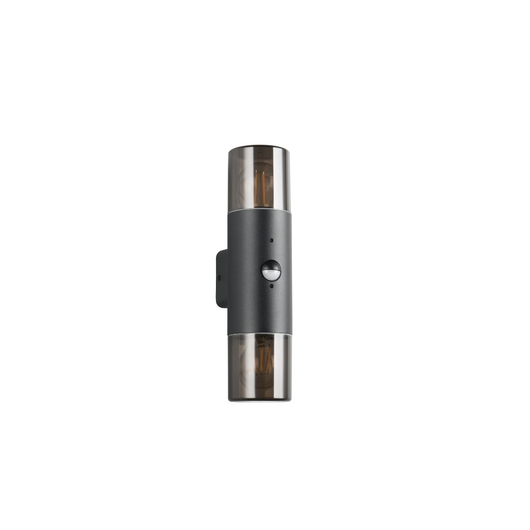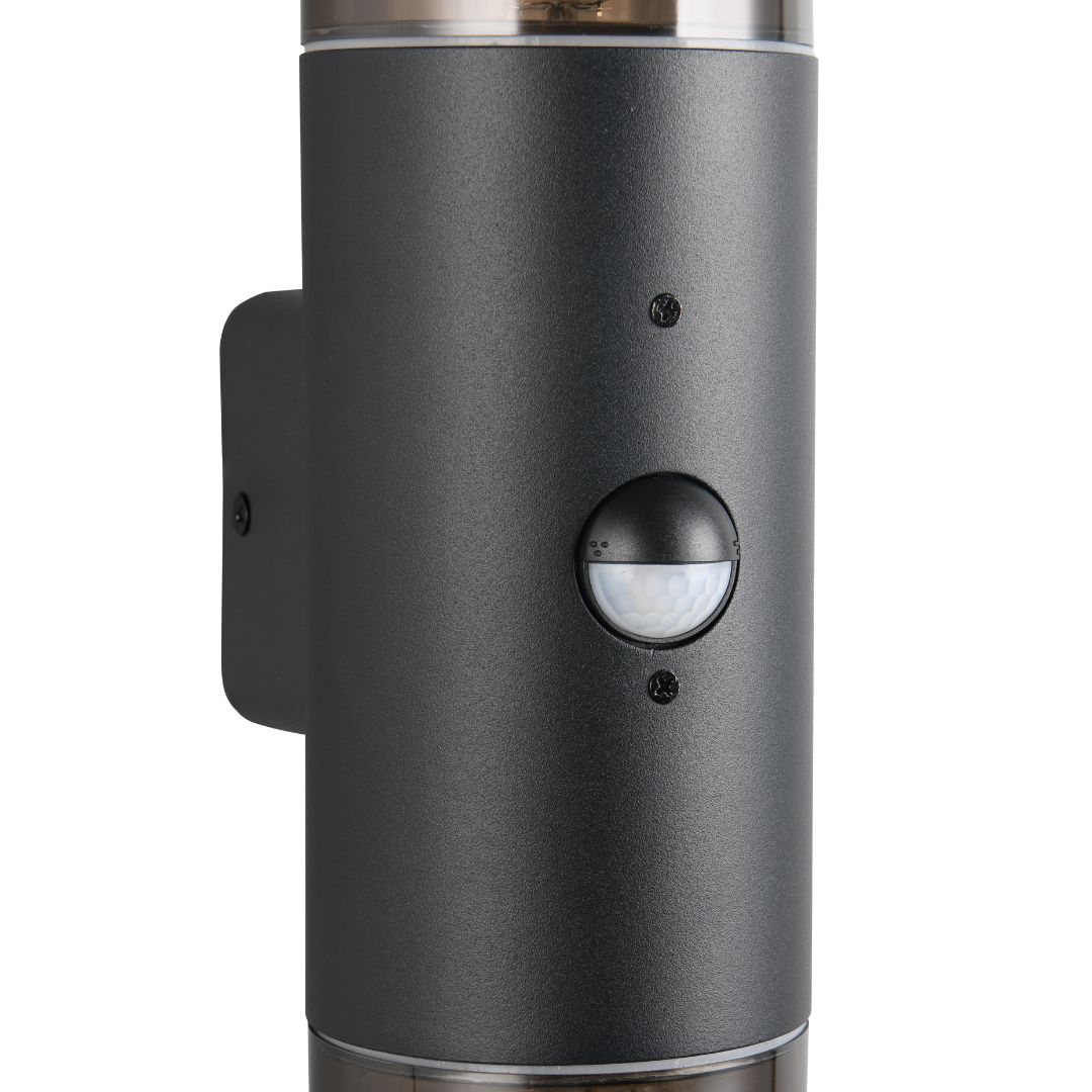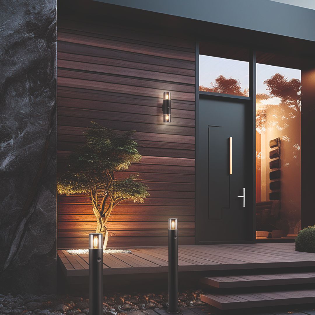 Decorativa e funcional – a luminária de parede da série HOOSIC com sensor de movimento integrado e iluminação ascendente e descendente. No escuro, a luminária de parede revela todo o seu efeito e ilumina uniformemente a área exterior, criando uma intensidade de luz eficaz e agradável. Graças ao alumínio fundido resistente às intempéries em combinação com o grau de proteção IP44, a luminária de parede é ideal para ser montada na fachada da sua casa, na área de entrada, na varanda ou no pátio. O design preto mate com plástico cor de fumo pode ser combinado de várias formas e garante um aspeto moderno.
