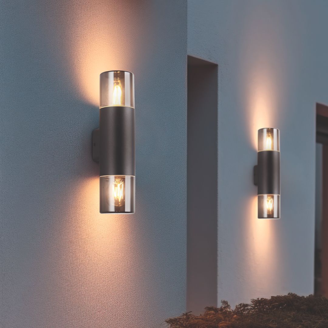 Decorativa e funcional – a luminária de parede da série HOOSIC com iluminação ascendente e descendente. No escuro, a luminária de parede revela todo o seu efeito e irradia a luz uniformemente para a área exterior, criando uma intensidade luminosa eficaz e agradável. Graças ao alumínio fundido resistente às intempéries em combinação com o grau de proteção IP44, a luminária de parede é ideal para ser montada na fachada da sua casa, na zona de entrada, na varanda ou no seu pátio. O design preto mate com plástico cor de fumo pode ser combinado de várias formas e garante um aspeto moderno.
