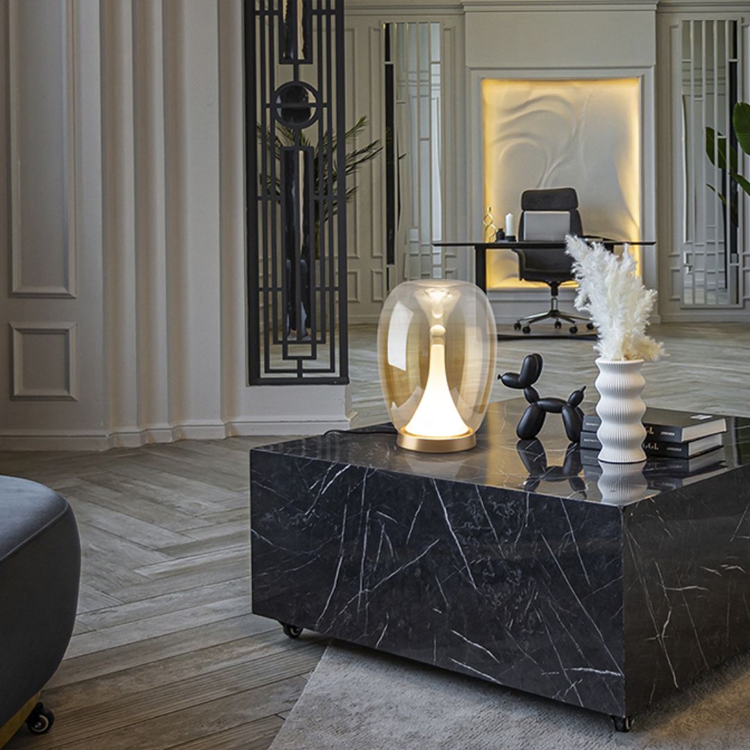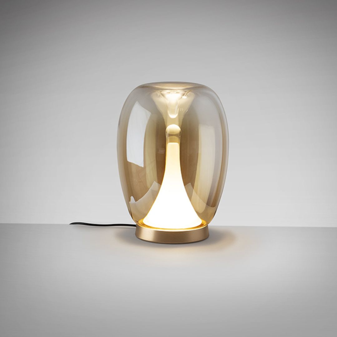 A coleção Suspiro da Schuller destaca-se pela sua elegância orgânica, centrada no uso de vidro soprado para criar peças de iluminação únicas. A estrutura é geralmente em alumínio anodizado com acabamentos em tons sofisticados como dourado/âmbar degradé ou cromado/fumo degradé (smoky), e integra uma fonte de luz LED e um difusor interior opala, garantindo uma iluminação suave e acolhedora. A coleção é completa por candeeiros de mesa e suspensões de uma só luz.