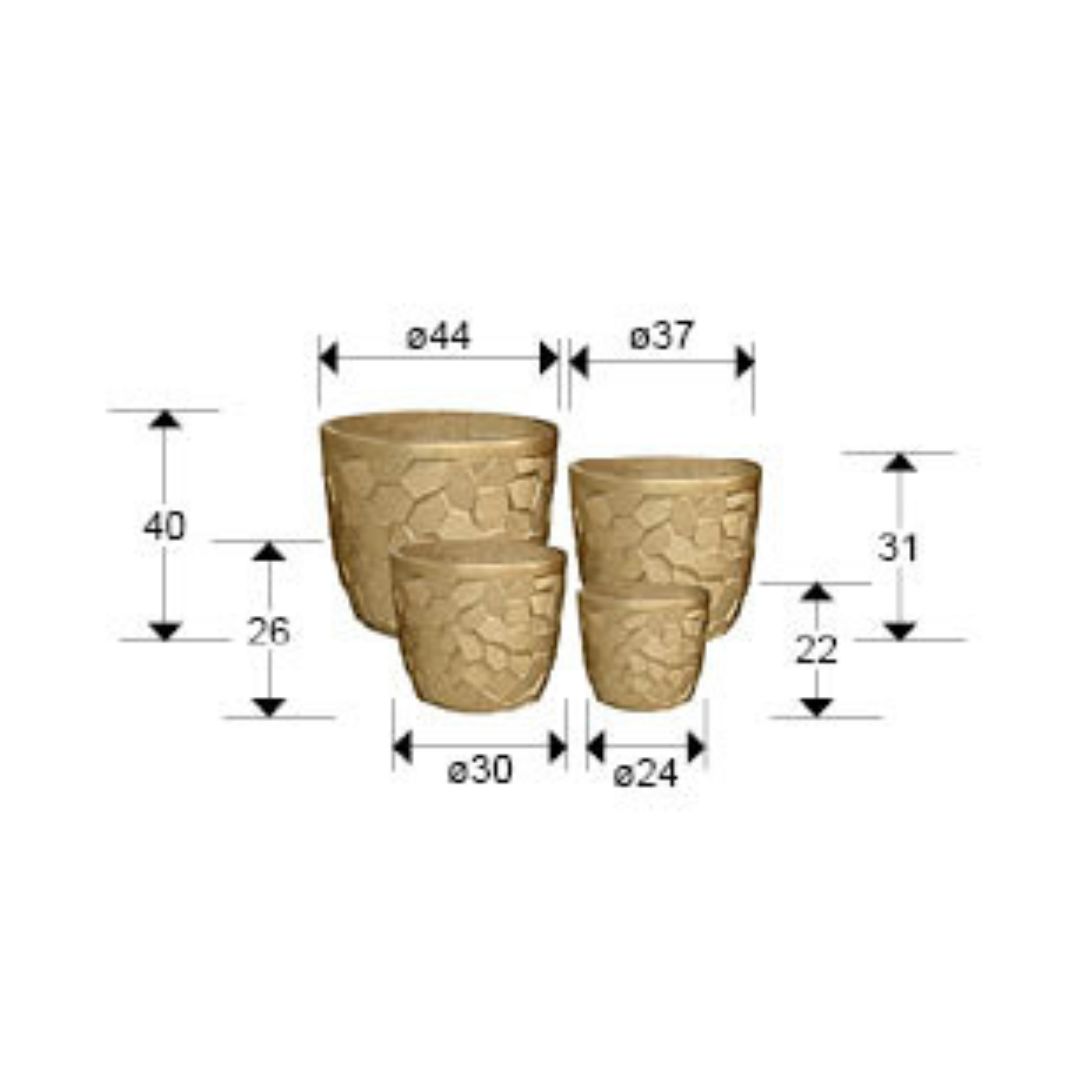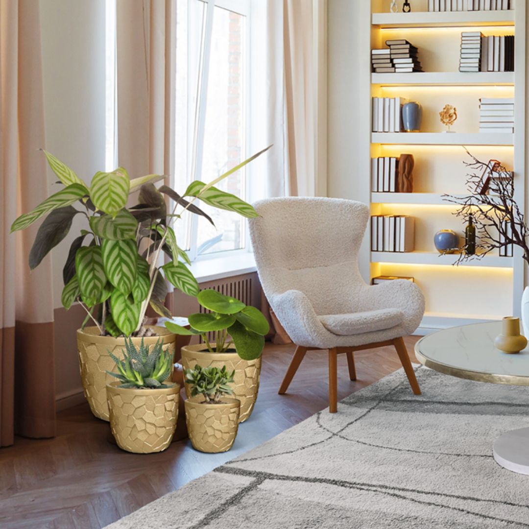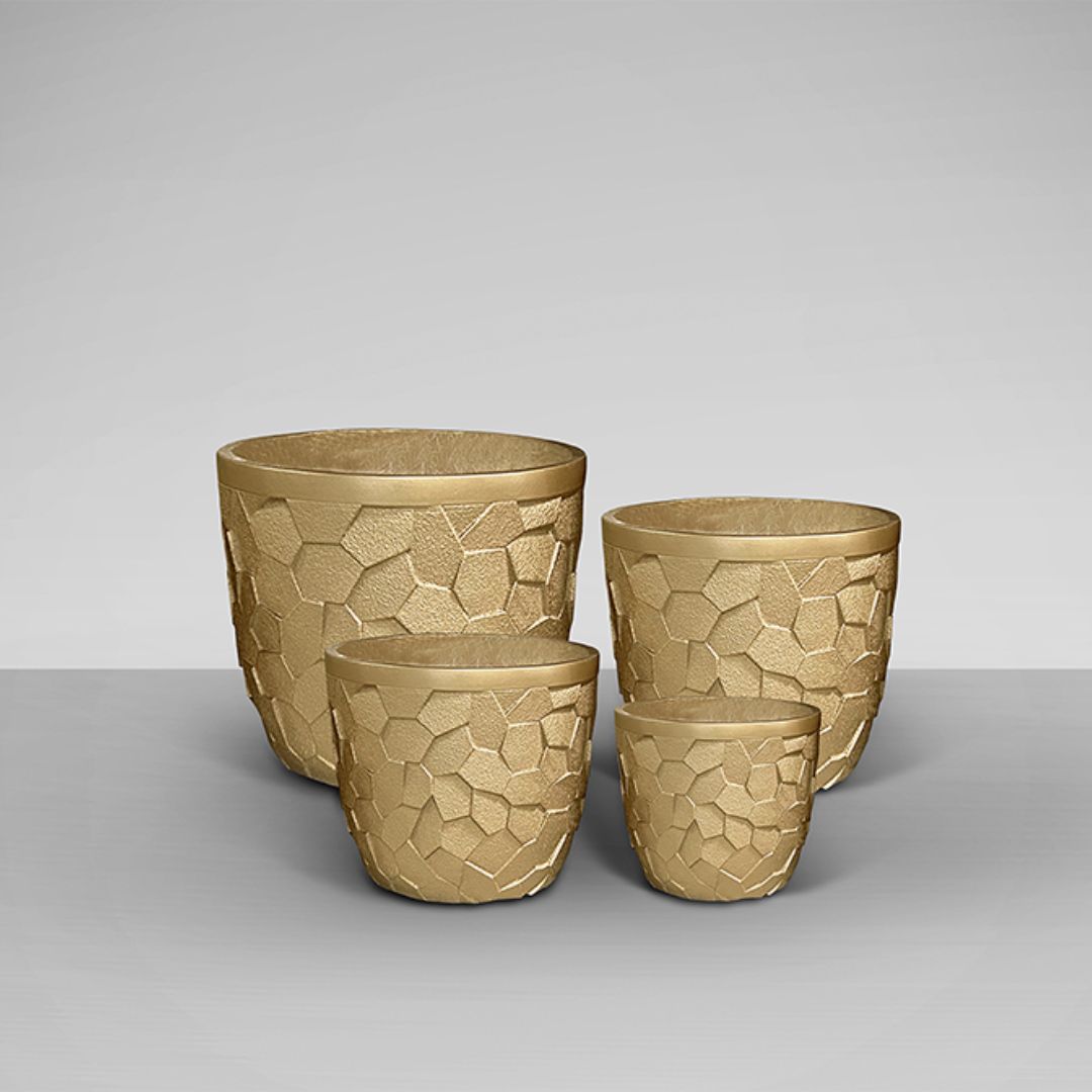 O conjunto Ilian da Shucller é composto por quatro floreiras (vasos) de diferentes tamanhos, apresentando um design que combina o rústico com o luxo. As peças são fabricadas em Argila de Fibra com um distinto e sofisticado acabamento dourado, conferindo-lhes um brilho imediato. A sua superfície exterior destaca-se pelo seu padrão geométrico tridimensional, que se assemelha a pedras ou mosaicos irregulares, conferindo-lhes um toque artesanal e orgânico. O tom dourado e a forma robusta tornam-nas ideais para ambientes de estilo moderno, glamour ou boho-chic, servindo como um ponto focal de cor e textura num espaço minimalista. Com o seu design texturizado, estas floreiras não só realçam a beleza de qualquer planta, como também redefinem o canto verde como um expositor de design elegante. A sua versatilidade permite o uso em conjunto, criando impacto no hall, ou separadamente, adicionando um toque luxuoso a cada divisão.