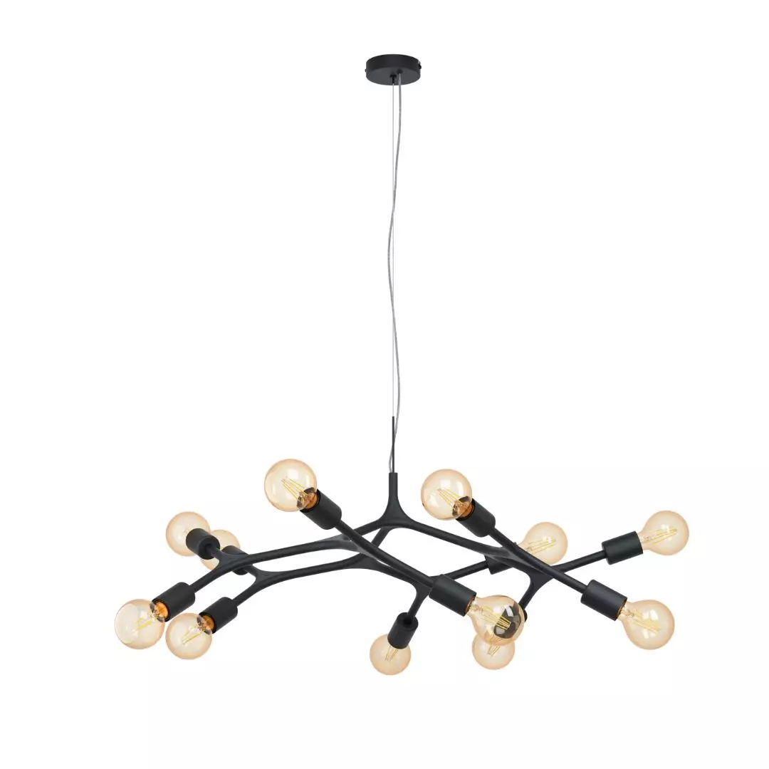 O candeeiro de teto suspenso BOCADELLA apresenta doze braços suspensos e ramificados em metal preto.