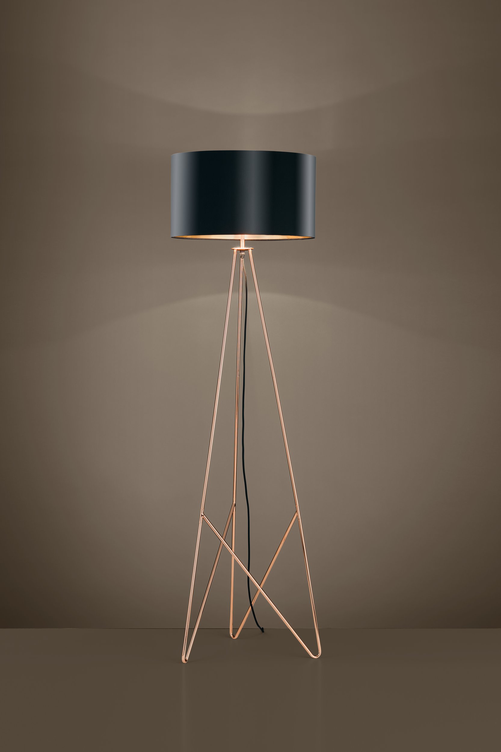 O candeeiro de pé CAMPORALE tem uma base metálica tripé com um acabamento em cor cobre e um abajur de tecido redondo preto com uma superfície interior em cor cobre. A luz pode ser ligada e desligada facilmente com o seu interruptor de chão. Quer seja no quarto, sala de estar, sala de jantar ou corredor, combina de forma perfeito com estilos minimalistas e modernos de decoração e proporciona uma iluminação soberba.