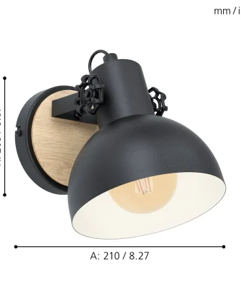 O aplique de parede LUBENHAM é fabricado em metal preto e possui uma cabeça giratória com um acabamento interior de cor creme. O elemento de madeira ligado ao corpo do design confere-lhe um aspecto acolhedor. Devido à mistura atraente de madeira e metal, este aplique combina na perfeição com interiores modernos de estilo vintage e industrial. A sua cabeça giratória permite-lhe ajustar a luz para acentuar áreas individuais da divisão, seja na sala de estar, no quarto, no corredor ou na sala de jantar.