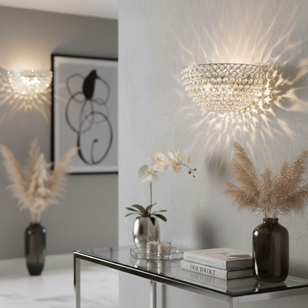 Uma coleção pensada para espaços onde predomina a alta decoração, com acabamentos metálicos aliados a vidros refletores. A Crystal é uma coleção coleção sofisticada e elegante, feito com cristais pequenos combinados com espelhos.