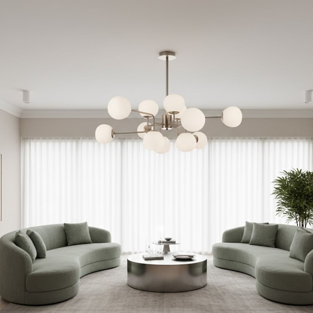 A coleção Erich, da Maytoni, agrupa pendentes, apliques, candeeiros de mesa e de pé num estilo que revisita o retro com elegância contemporânea. A estrutura metálica (latão rosa ou níquel) sustenta suaves globos em vidro opalino ou alabastro texturizado, oferecendo uma iluminação difusa e acolhedora. Cada peça permite ajustes de altura ou posição para máxima versatilidade. Ideal para salas, restaurantes, hotéis ou espaços de receção, Erich combina a severidade minimalista das linhas metálicas com a suavidade visual dos difusores, resultando numa presença estética marcante.