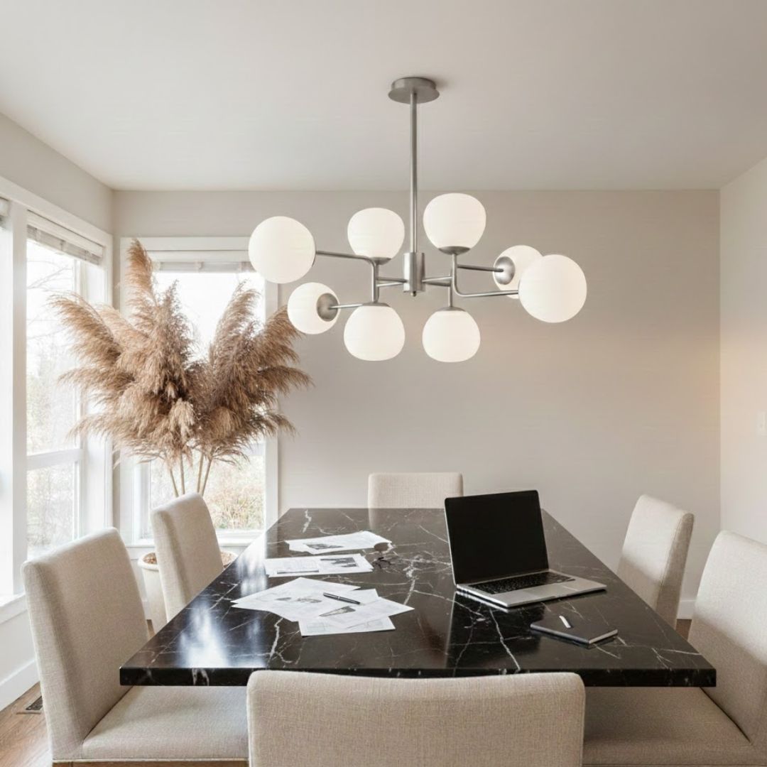 A coleção Erich, da Maytoni, agrupa pendentes, apliques, candeeiros de mesa e de pé num estilo que revisita o retro com elegância contemporânea. A estrutura metálica (latão rosa ou níquel) sustenta suaves globos em vidro opalino ou alabastro texturizado, oferecendo uma iluminação difusa e acolhedora. Cada peça permite ajustes de altura ou posição para máxima versatilidade. Ideal para salas, restaurantes, hotéis ou espaços de receção, Erich combina a severidade minimalista das linhas metálicas com a suavidade visual dos difusores, resultando numa presença estética marcante.