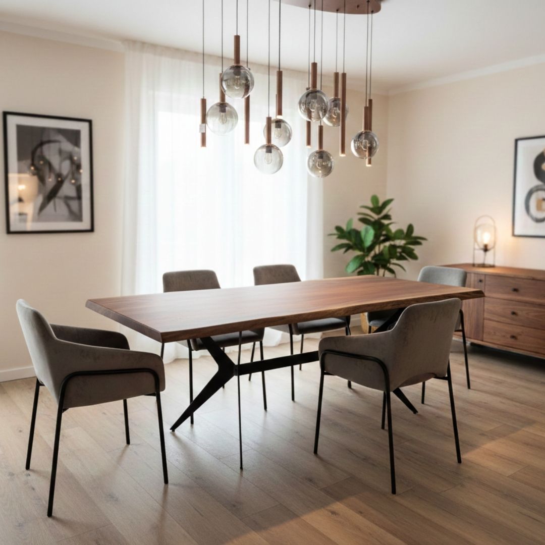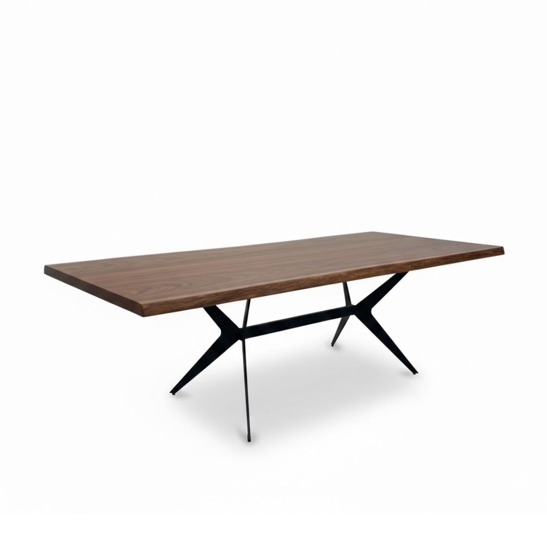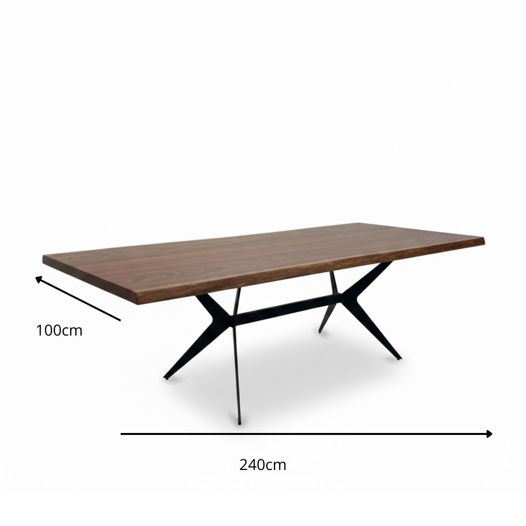 Esta peça exclusiva combina a robustez da madeira de acácia com um design contemporâneo e arrojado. O seu tampo destaca-se pelas bordas laterais irregulares (live edge), que preservam a silhueta orgânica da árvore, tornando cada mesa única. A estrutura é suportada por pés de metal preto com um design geométrico cruzado em “X”, que garante máxima estabilidade e um visual industrial sofisticado. É a fusão perfeita entre a autenticidade da natureza e o estilo moderno, ideal para ser o centro das atenções na sua sala de jantar.
