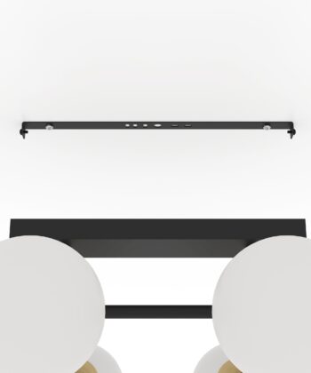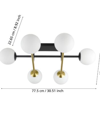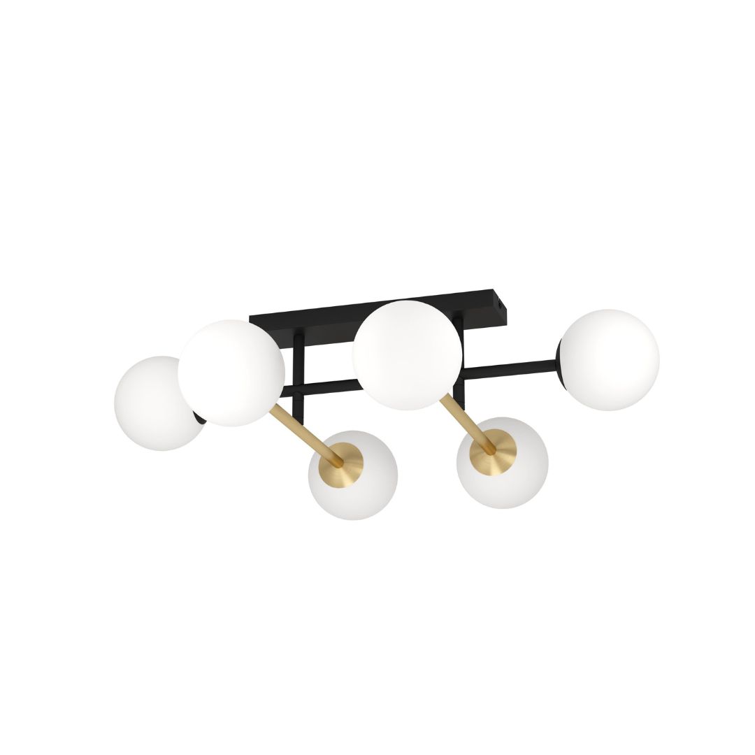 O candeeiro de teto PAZ tem um braço horizontal em metal preto e dois braços em metal com acabamento em latão escovado. Estes estão equipados com seis esferas luminosas de vidro opalino mate em branco. Os dois braços inferiores em latão escovado são ajustáveis, pelo que podem ser reorganizados para personalizar o aspeto do candeeiro e criar a iluminação perfeita para o seu espaço de vida. Combina na perfeição com interiores modernos da moda, proporcionando a iluminação ideal para a sua casa, quer seja na cozinha, na sala de estar, no corredor ou no quarto.
