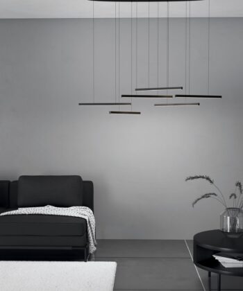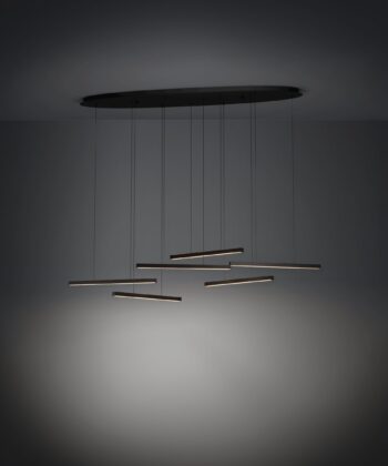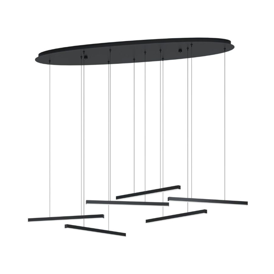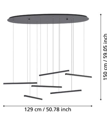O candeeiro de teto suspenso LINDOZA LED tem seis barras de luz LED em metal preto, suspensas em vários ângulos a partir de uma cobertura metálica oval preta. Os LED integrados sob as coberturas de plástico branco emitem uma luz branca quente ideal e são reguláveis através de um regulador rotativo que pode instalar na parede (vendido separadamente, consulte lista de compatibilidades). Tem um aspecto leve e divertido que desmente o seu tamanho de 116 cm e pode ser integrado em qualquer estilo de design de interiores moderno sendo particularmente apelativo para a instalação sobre uma mesa na sala de jantar.