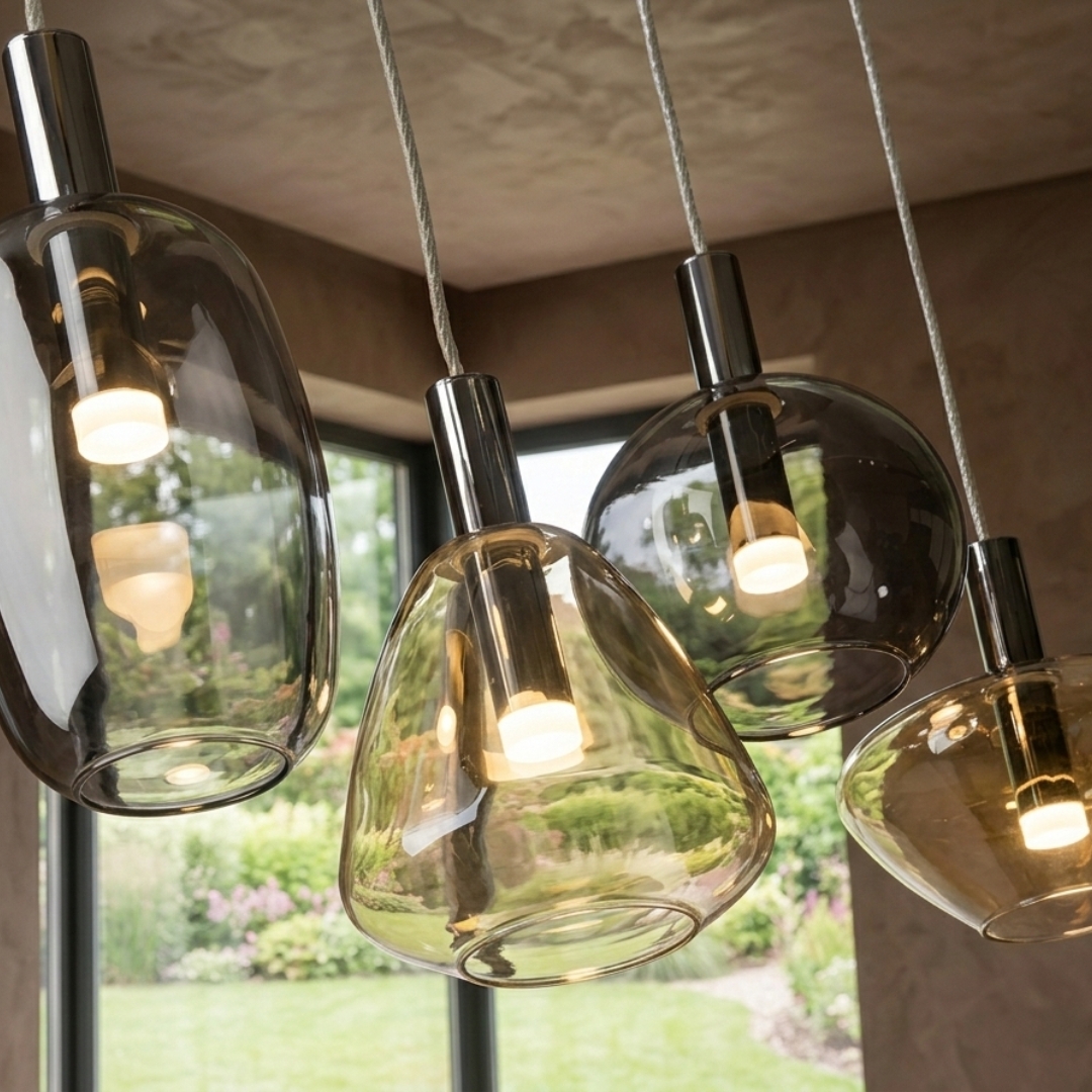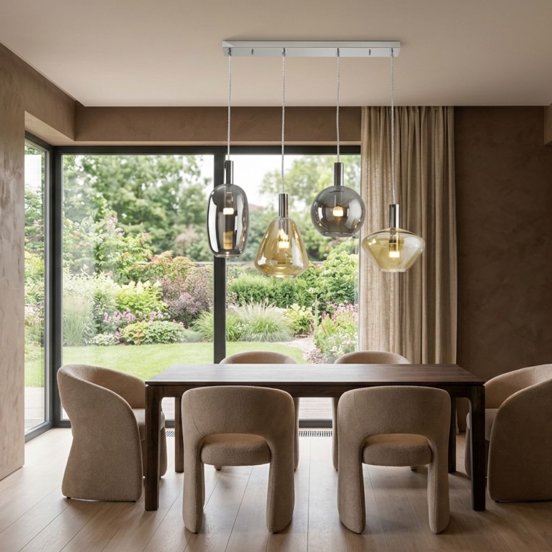 Candeeiro de 4 luzes, realizado em metal cromado. Abajures combinados em vidro âmbar e smoke, com difusor em acrílico opalino. Altura regulável. 20W LED, 1800 lm, 3000K.