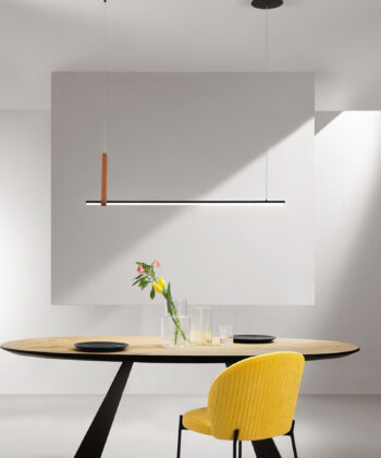 As suas linhas finas e geométricas tornam-na perfeita para valorizar mesas de jantar, proporcionando uma iluminação uniforme e acolhedora, sem comprometer a harmonia do espaço.