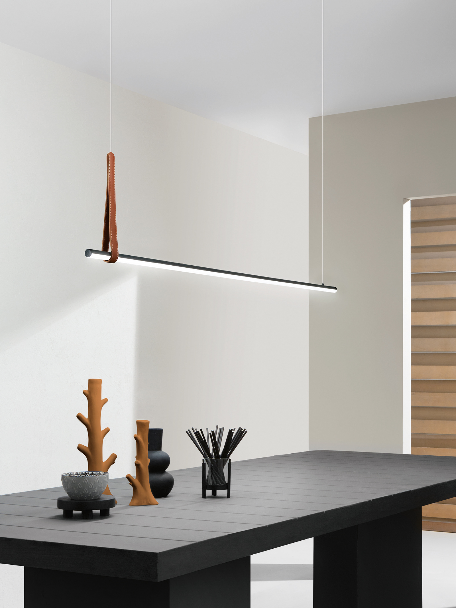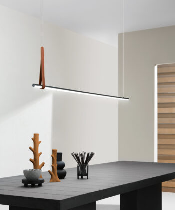 A suspensão linear Regoli 150 da Ondaluce combina design minimalista e alta performance luminosa. Com estrutura em metal pintado e detalhes em couro sintético, este modelo destaca-se pela elegância discreta e pelo cuidado nas proporções.