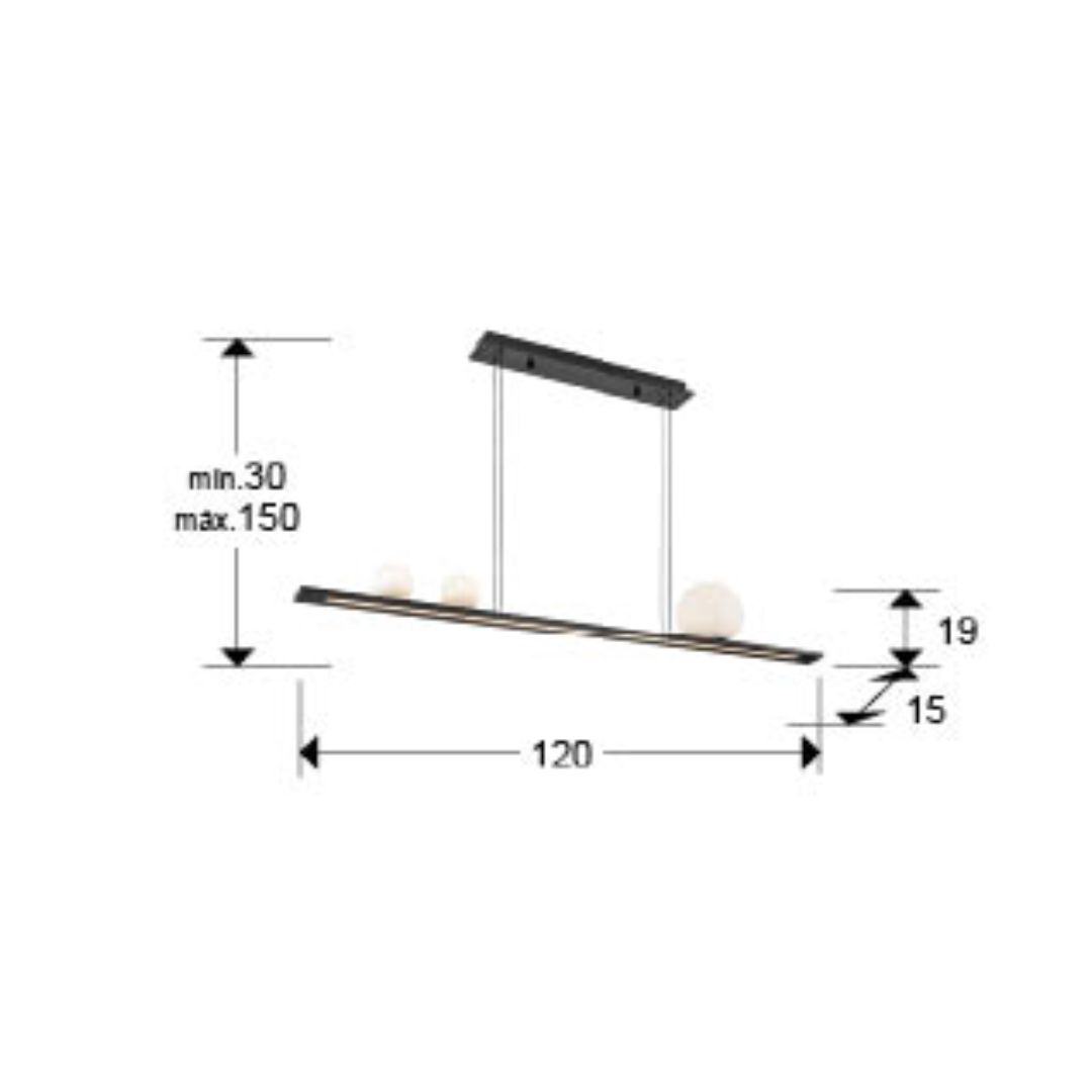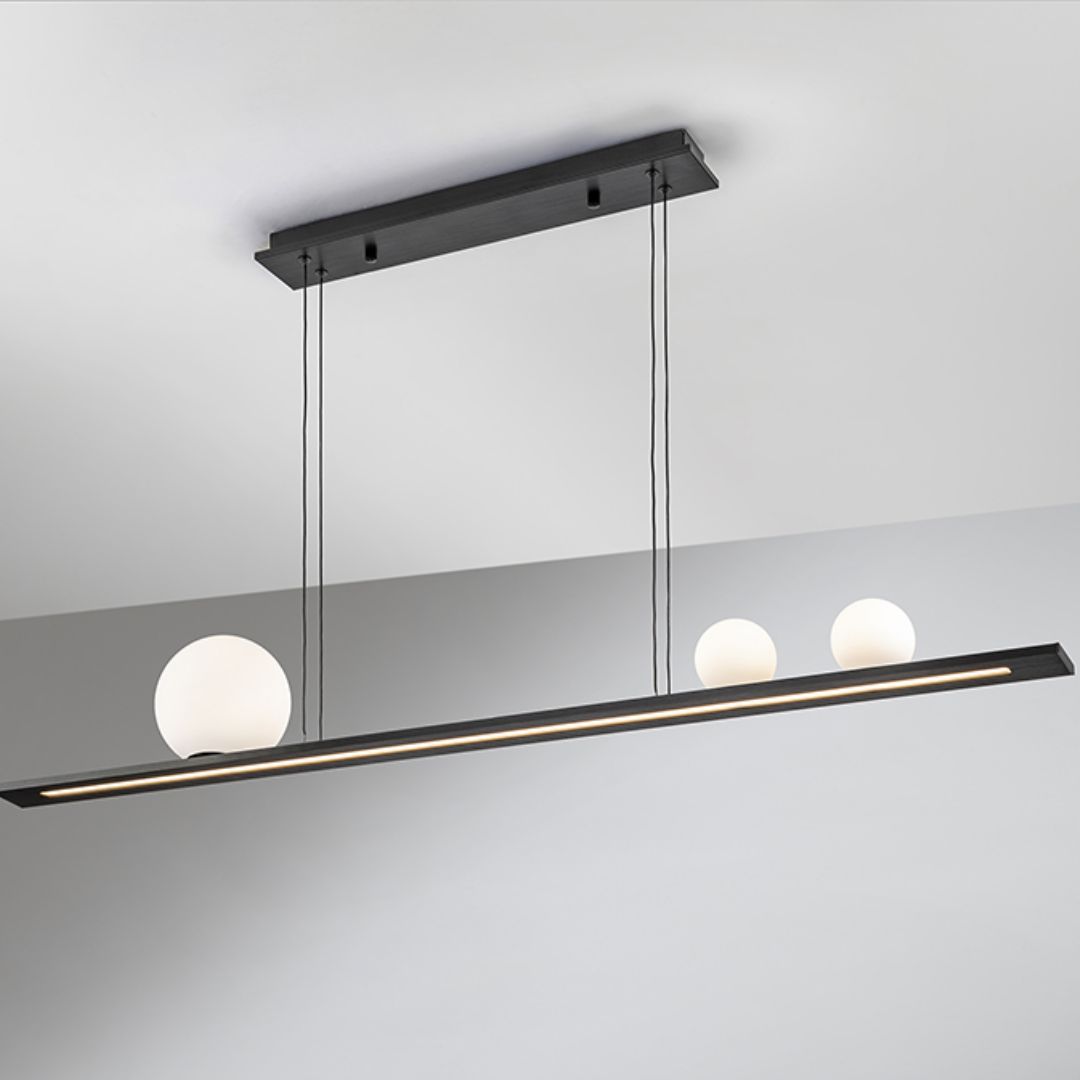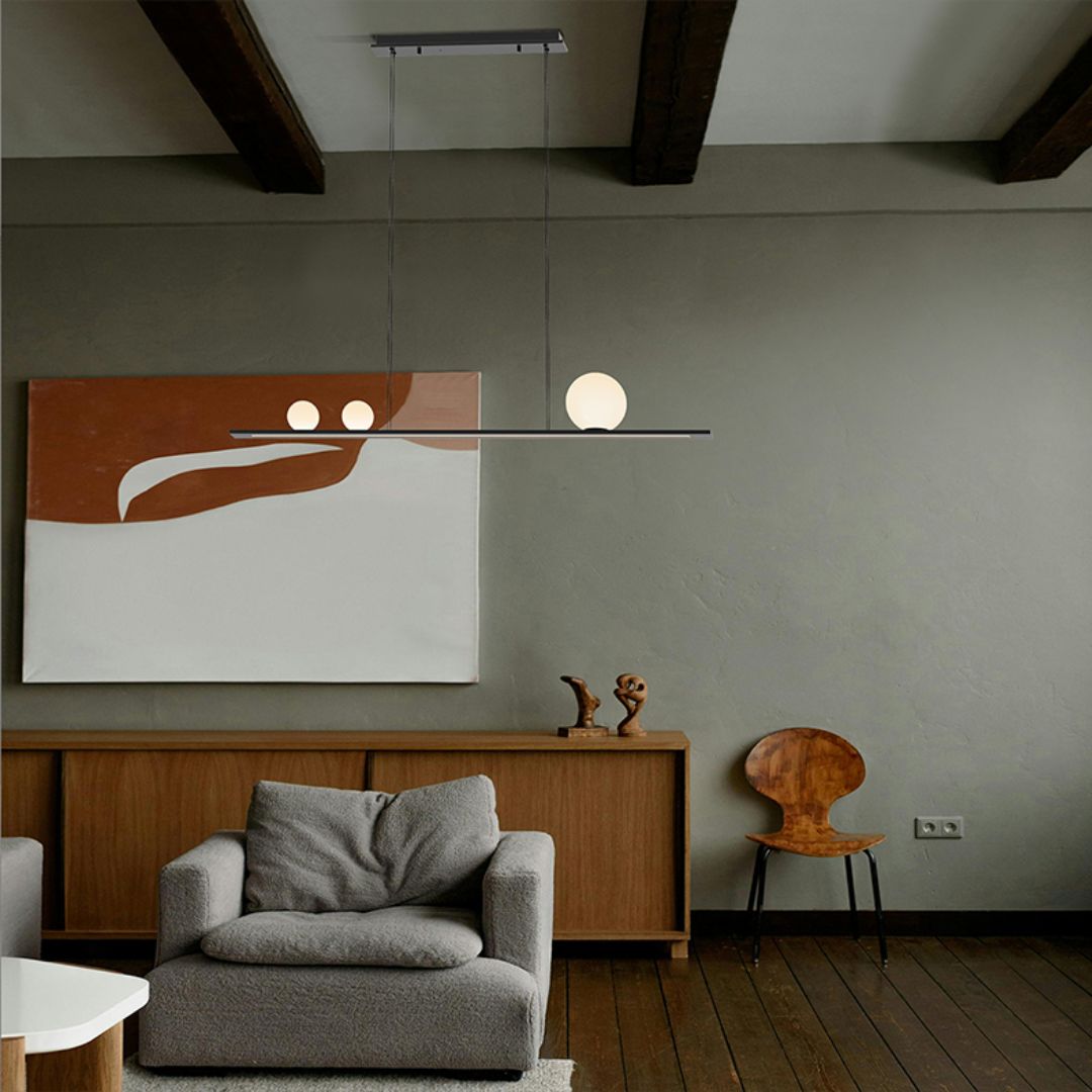 A coleção Mila da Schuller apresenta duas suspensões lineares minimalistas — uma em preto e outra em dourado — com três esferas de vidro branco e LED integrado abaixo. O design simples e elegante traz uma luz uniforme e suave, ideal para ambientes modernos. Estas peças tornam-se elementos de destaque discretos e sofisticados, combinando funcionalidade e estética contemporânea ideia para iluminar mesas de jantar.