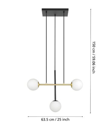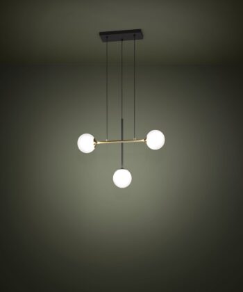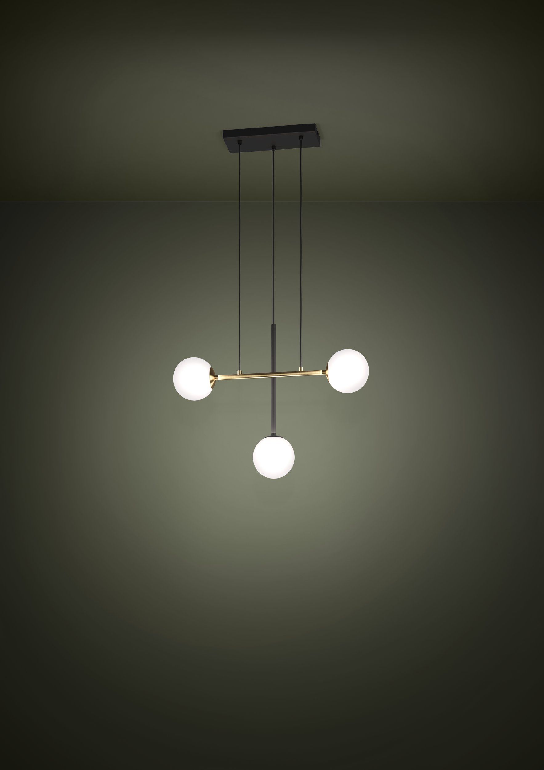 O candeeiro suspenso PAZ é composto por um elemento metálico preto suspenso verticalmente e um elemento metálico horizontal em latão escovado. Estes são combinados com três esferas de luz em vidro opalino mate em branco, uma em cada extremidade dos elementos que se intersectam. A cobertura quadrada em metal preto e os cabos têxteis da mesma cor combinam lindamente o aspeto elegante do candeeiro. Combina na perfeição com os interiores modernos da moda, proporcionando uma iluminação que funciona bem na sala de estar ou de jantar.