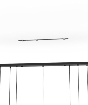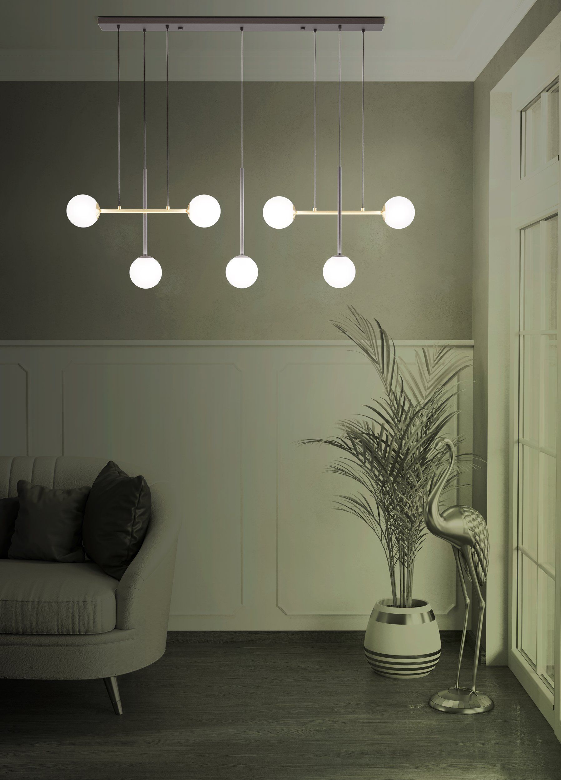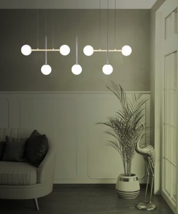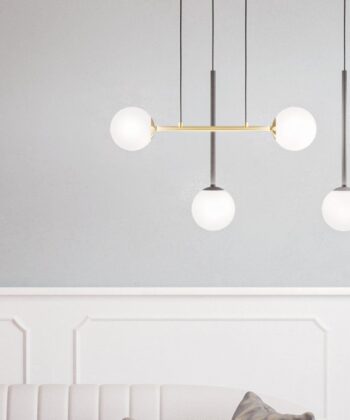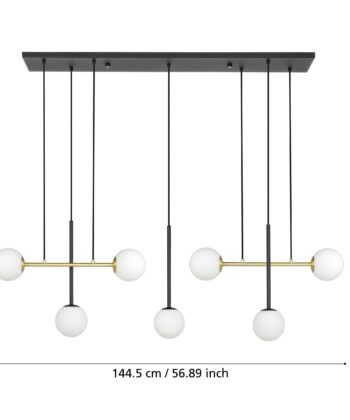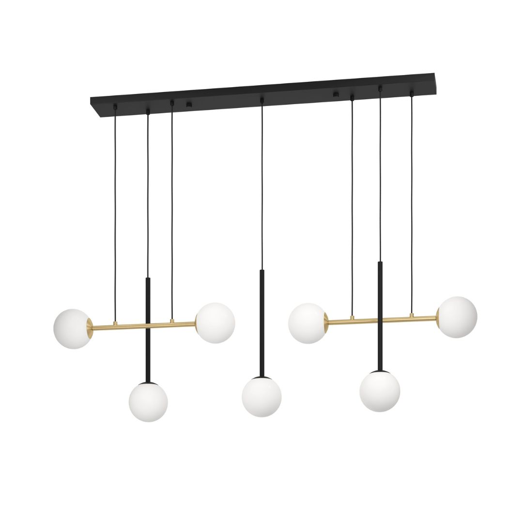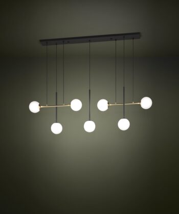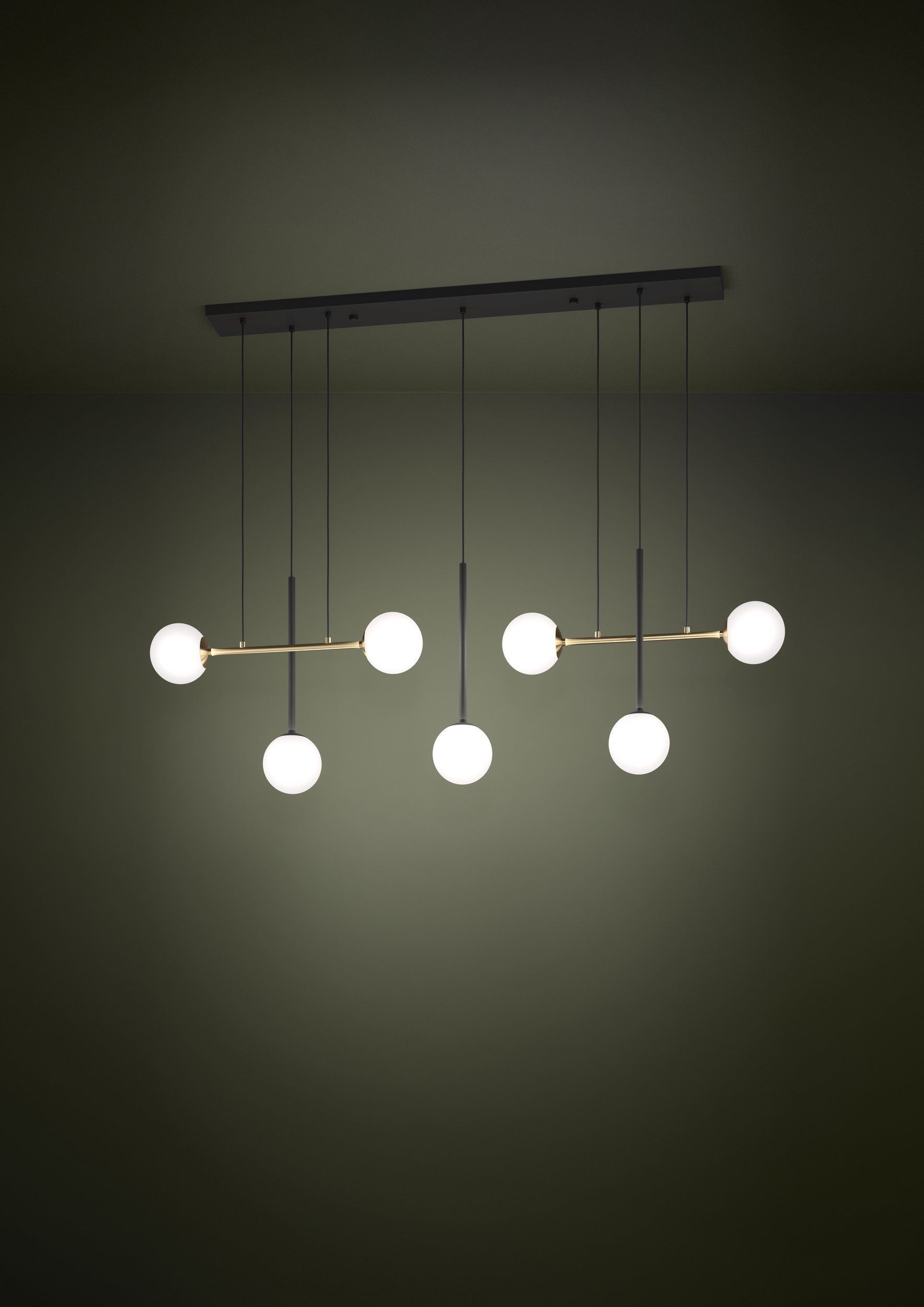 O candeeiro suspenso PAZ é composto por dois elementos de aço que se intersectam, com acabamento em preto e latão escovado, suspensos por cabos têxteis pretos a partir de uma cobertura metálica alongada. Tem sete esferas de luz em vidro opalino mate branco, uma em cada extremidade destes elementos de aço. No centro da estrutura, encontra-se também um único casquilho preto suspenso verticalmente, que complementa o aspeto elegante e atraente do candeeiro. Combina na perfeição com os interiores modernos da moda, proporcionando uma iluminação elegante que funciona bem na sala de estar ou de jantar.