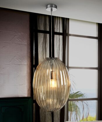 Candeeiro de uma luz realizado em metal acabamento cromado. Tulipa pequena de vidro tom fumado. Regulável em altura. Inclui lâmpada dimável E27 LED 8W.